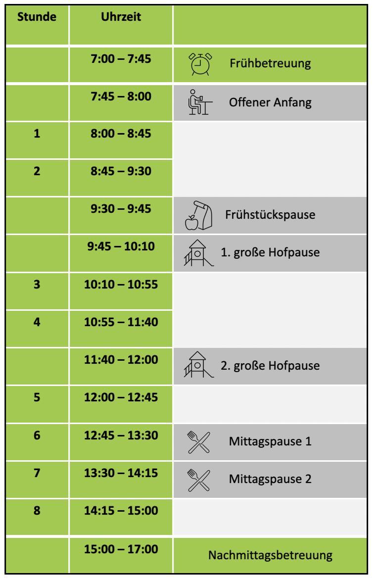 Unsere Schulzeiten sind verlässlich. Dies bedeutet, dass ohne vorherige Ankündigung Kinder aus den Klassenstufen 1/2 nie vor 12 Uhr die Schule verlassen und Kinder aus den Klassenstufen 3/4 nie vor 12:45 Uhr.